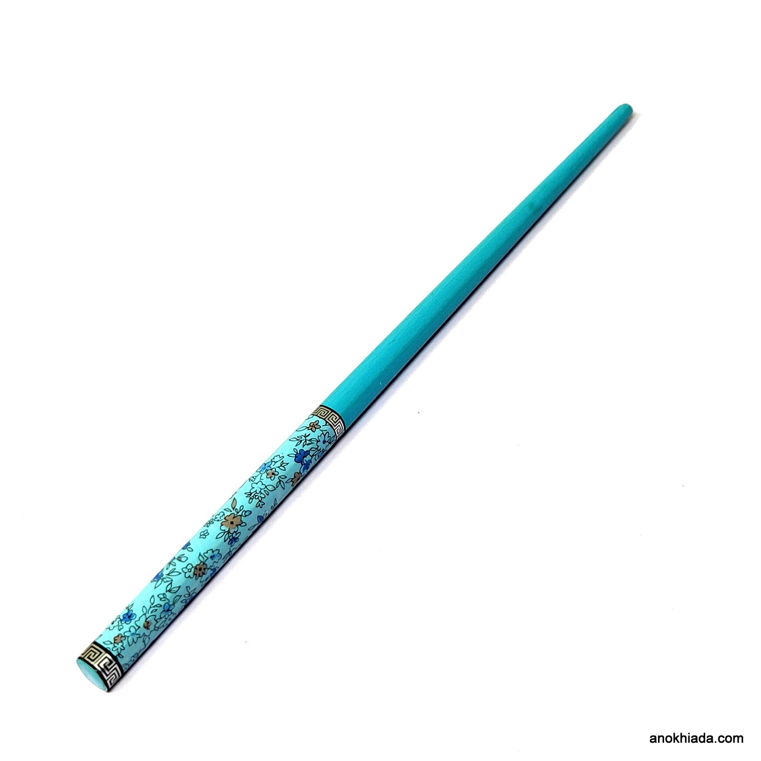 Anokhi Ada Flower Print Turquoise Blue Wooden Juda Stick/Bun Stick - (99-08C Juda Stick)