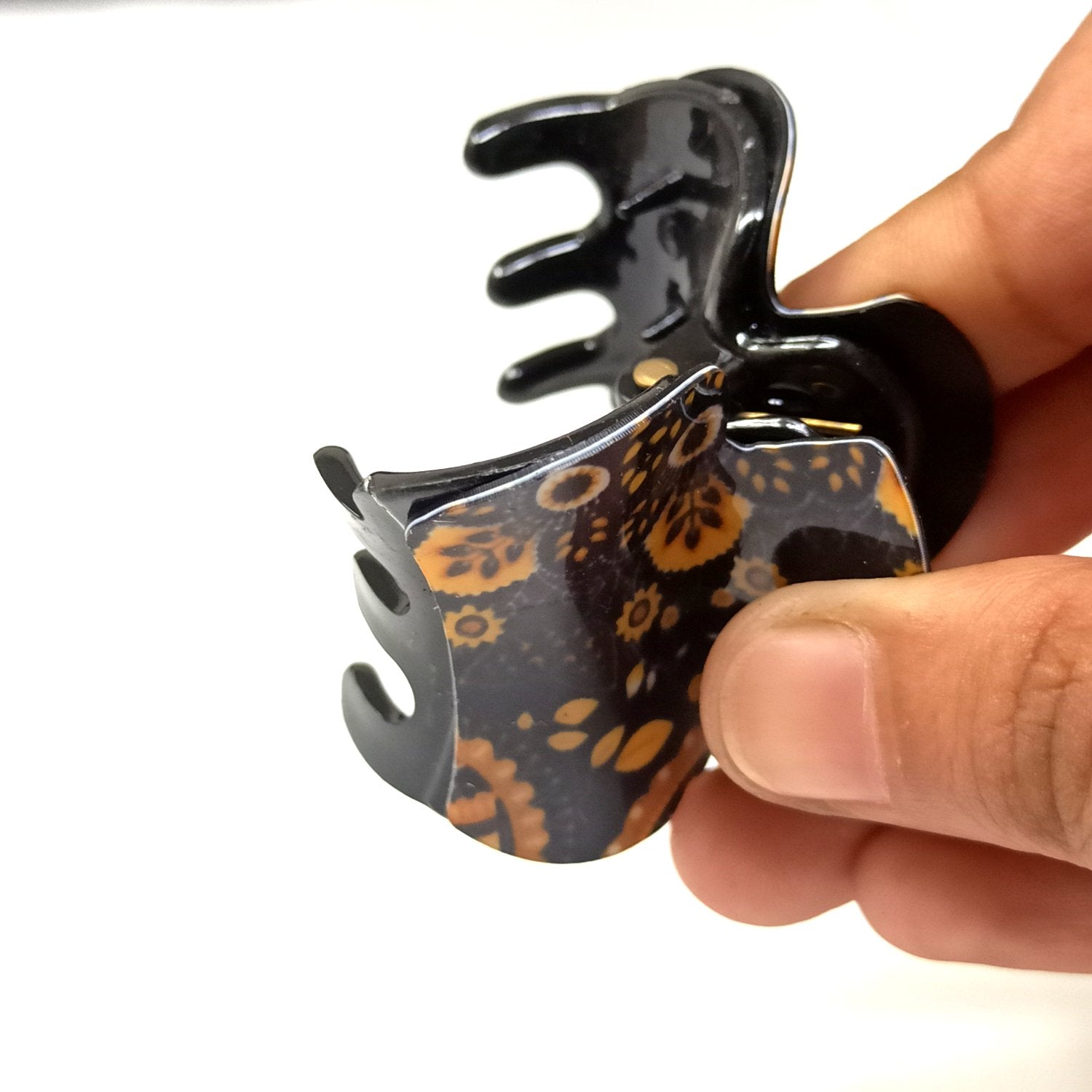 This Small hair clutcher is made of Translucent Hair Claw covered with a printed Plastic Sheet and must for everyday usage. The length of this clutcher is 3.5 cm and the width of this clutcher is 3.5 cm. This clutcher may be used as a daily use hair accessory or you may also use this clutcher as party wear.