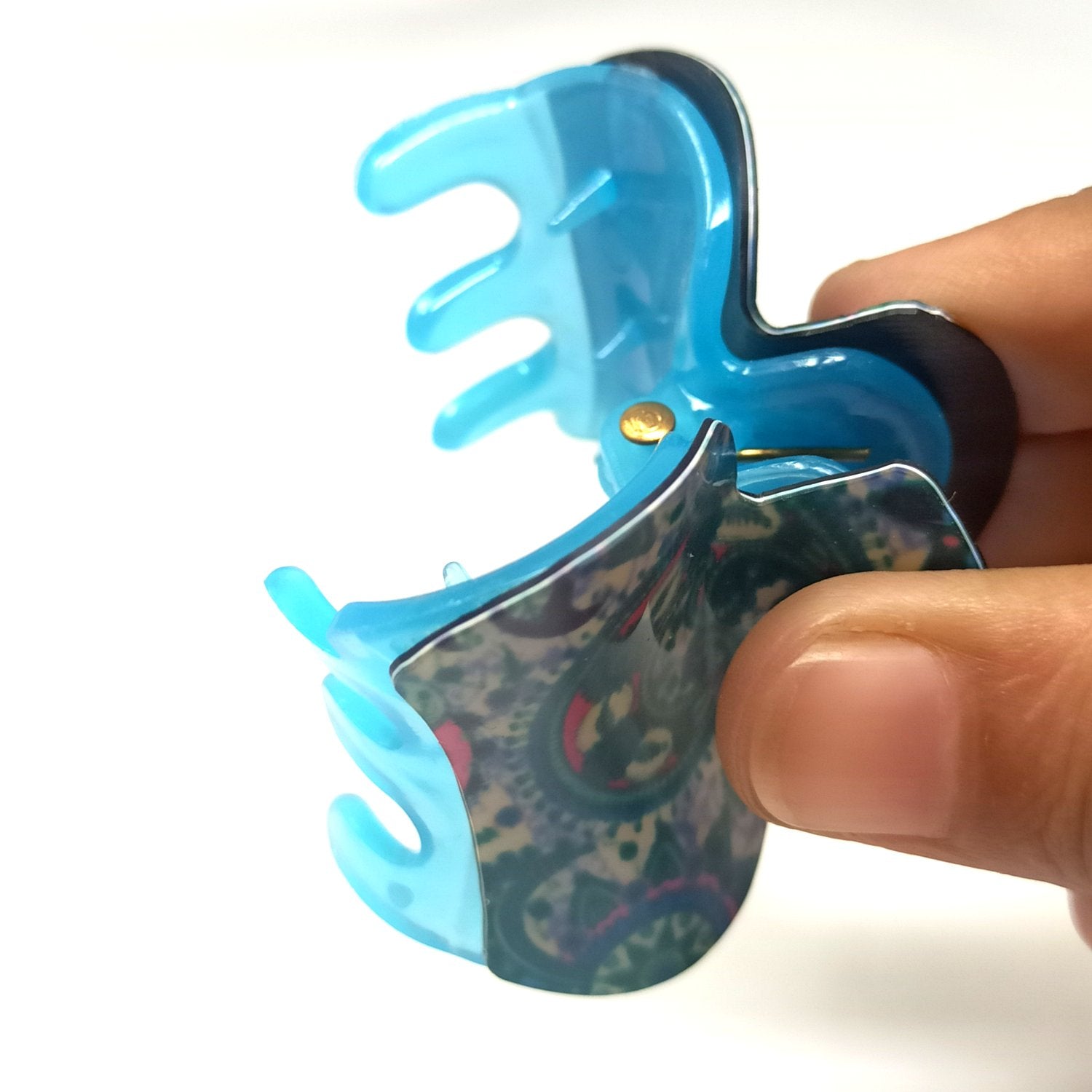 This Small hair clutcher is made of Translucent Hair Claw covered with a printed Plastic Sheet and must for everyday usage. The length of this clutcher is 3.5 cm and the width of this clutcher is 3.5 cm. This clutcher may be used as a daily use hair accessory or you may also use this clutcher as party wear.