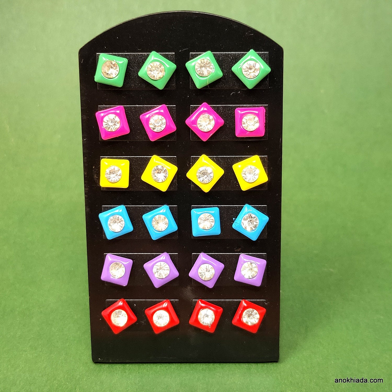 Anokhi Ada Square Rhinestone Stud Earrings for Girls and Women (Multi-Colour, Pack of 12 Pairs)-AQ-10