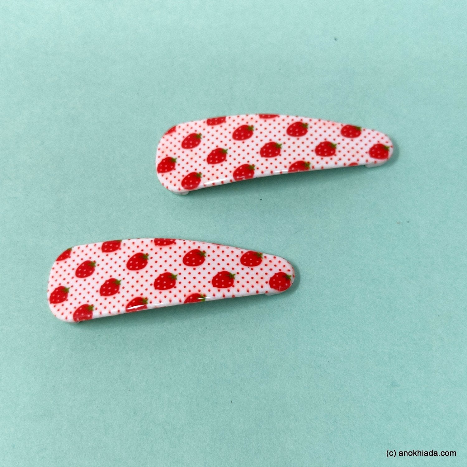 - Design: Strawberry Print Plastic on Metal Tic Tac Hair Clips