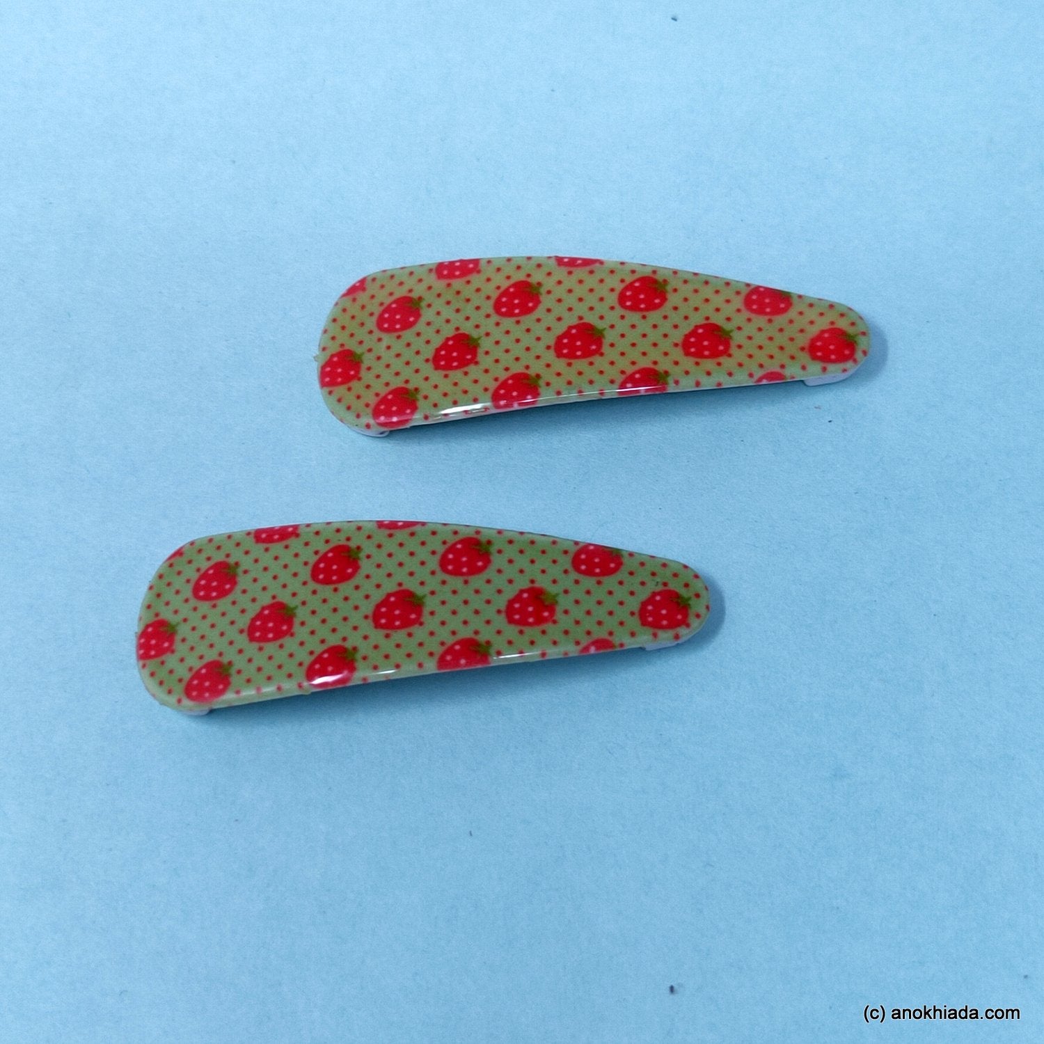 - Design: Strawberry Print Plastic on Metal Tic Tac Hair Clips
