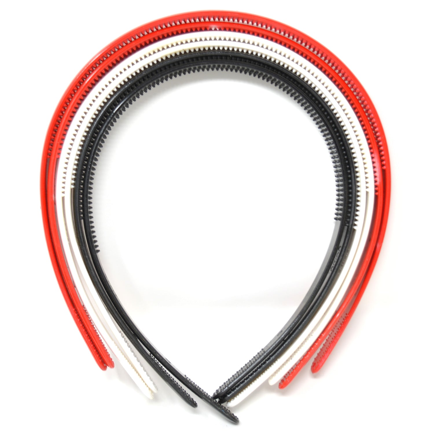 Set of six plane and sleek plastic hair band, in Red, Black and White Color. These hair bands are of premium quality and made with heavy and flexible plastic. Almost unbreakable, this is a must have for any school going girl.